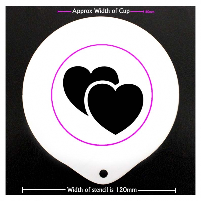 The dimensions of these commercial coffee stencils are approximately 120mm wide and 130 long (including the handle)